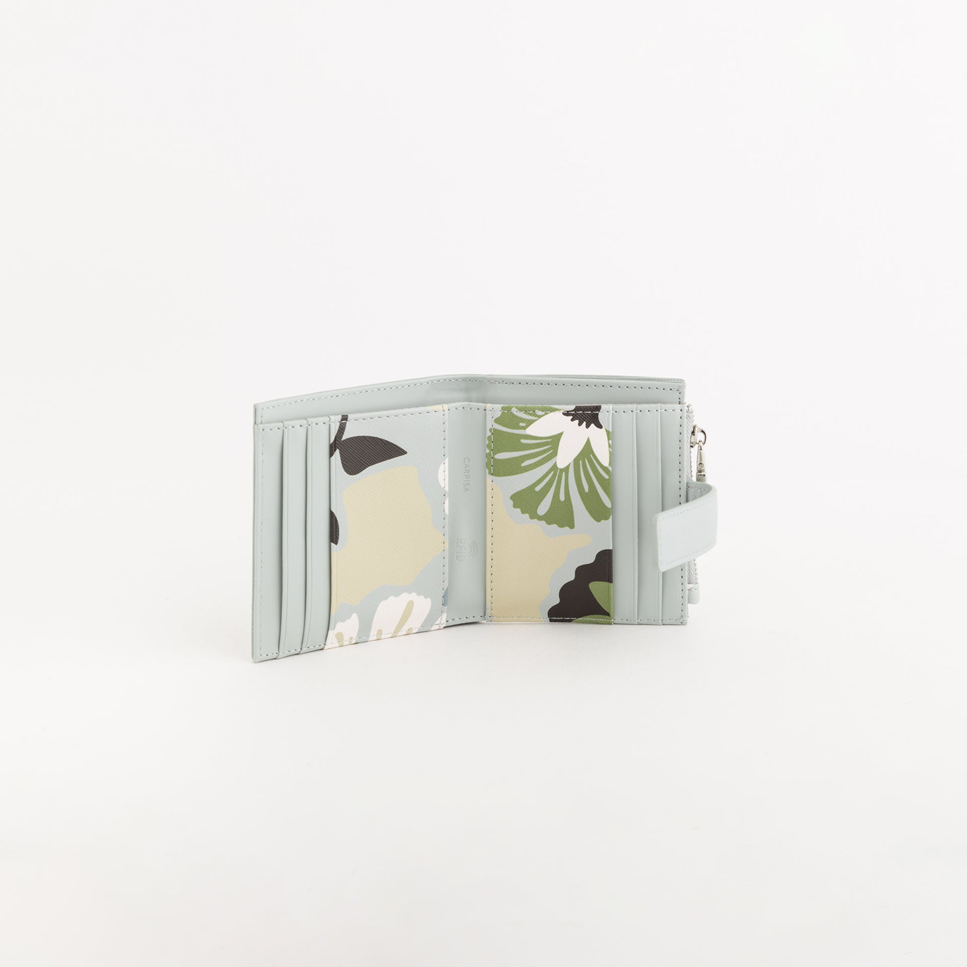 Small wallet from the Bouquet line by Carpisa in printed PU. This model features a billfold pocket, coin pocket, document slot, 9 card slots, and an RFID system that protects your cards from data theft.