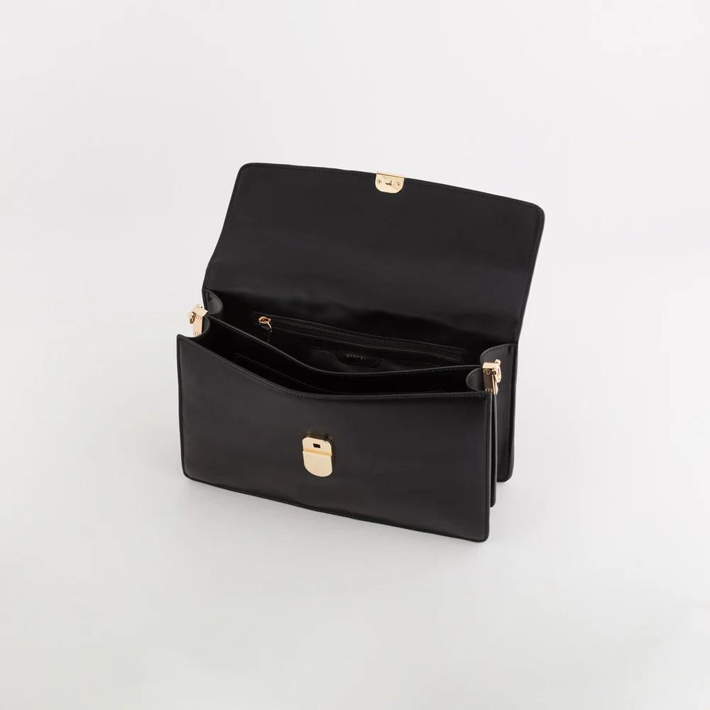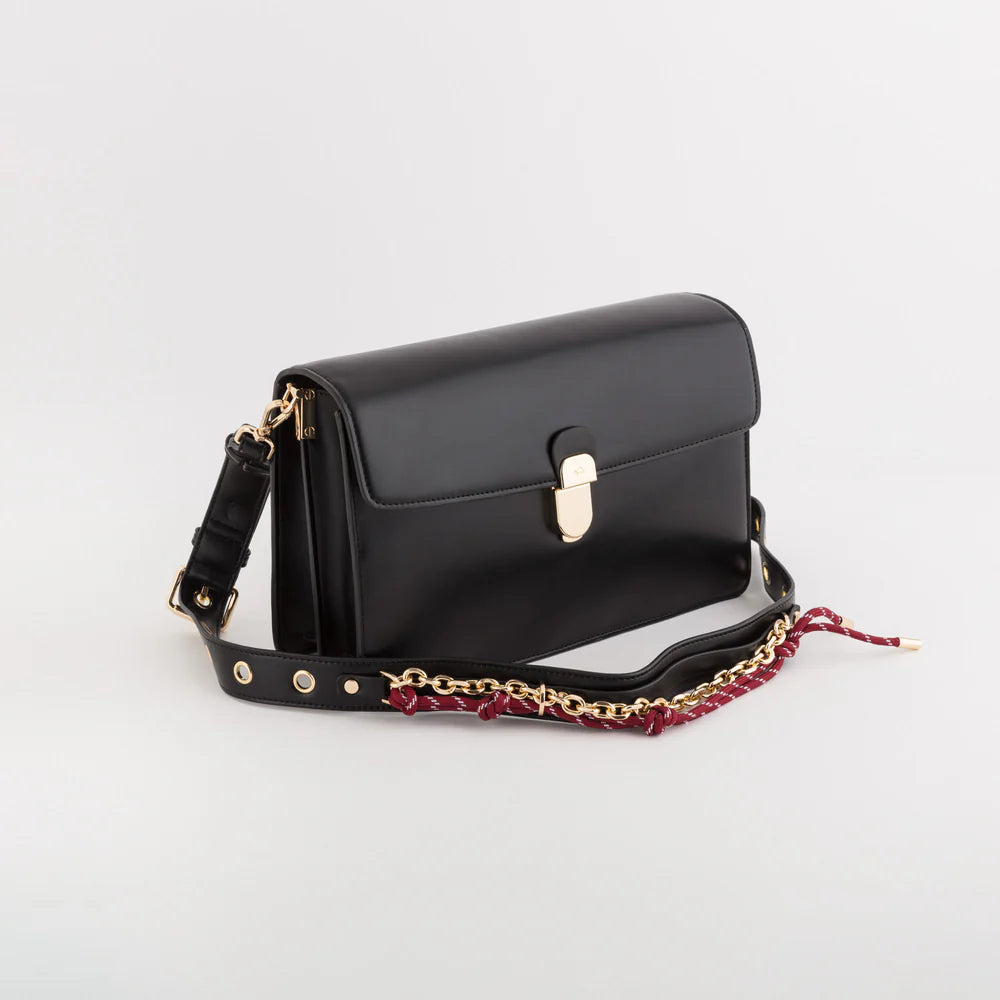 The bag features a flap closure, two compartments, two inside pockets, an outside back pocket, and an additional adjustable PU and gold chain shoulder strap.
